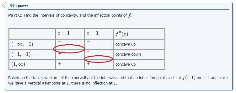 Based on the table, we can tell the concavity of the intervals and that an inflection point exists at $$f(-1)=-1$$ and since we have a vertical asymptote at 1, there is no inflection at 1.