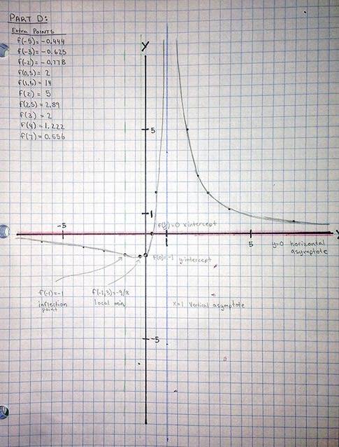 Based on the table, we can tell which intervals are increasing and decreasing and that the local minimum is $$f(-1/3)=-9/8$$ and since we have a vertical asymptote at 1, there is no local max.