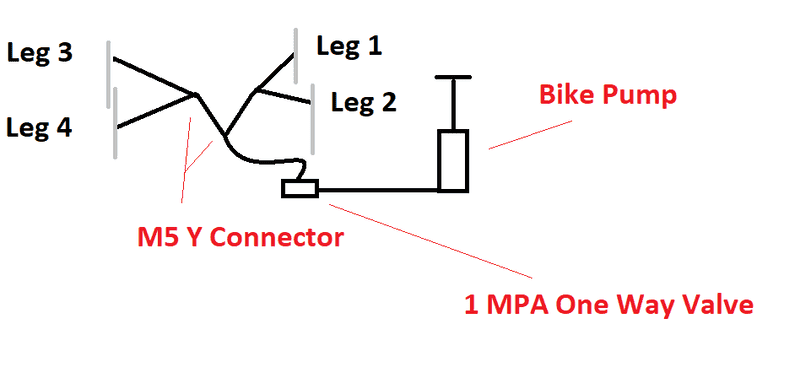 Starting from a foot pump or bicycle pump, running hose into a 1 way or speed control valve 1 MPA (so the air pressure stays in the cylinder and the table height is maintained until valve is released) and then to a Y connector which would split to 2 more y Connectors and then run to each cylinder (Diagram Attached). Do you guys think this idea will work? I am curious if a 1 MPA valve will hold the weight of a person, as well as the M5 or hose Y connectors without bursting? Any advise you can give would be greatly appreciated!