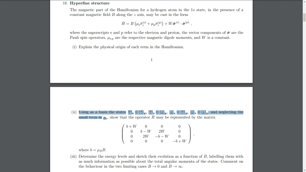 Now when we have an H atom, we have a proton and electron, so the wavefunction now is the direct product of the spin states of electron and proton. Assuming these are (0,1) and (0,1), so both are in down state, what does the direct product look like? (0,1,0,1)?