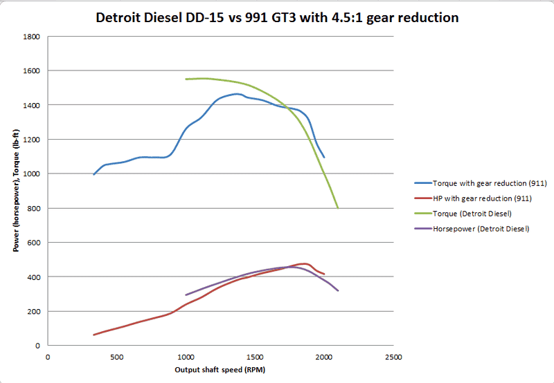 Just for fun, let's say that all of these engines have the same maximum power, no matter what it is, no matter at what rpm. Which engine will give the highest acceleration at wheel rpm of 500, 1000 and 2000 rpm? Let's do the calculations: