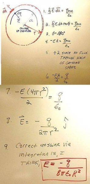 - Participants discuss the use of electric field equations and integration, questioning the applicability of Gauss' Law due to the lack of symmetry in the charge distribution. There are inquiries about the direction of the electric field and the implications of using Gauss' Law in this context.