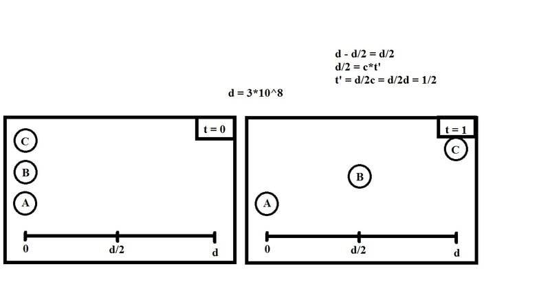 When I think of the speed of light being constant for all reference frames, I imagined the scenario in the picture below to exemplify it. Object A is always at rest, object B is moving at half the speed of light along the only given axis, and object C is a light particle moving at the speed of light along the only given axis. The objects are placed at different heights in the image only for visual clarity, so a 1D scenario. The frame on the left is t = 0 (say t is for object A and t' for object B) the objects are all at rest (I know object C can never be at rest if it's a light particle, but then let's just assume it comes into existence the moment the scenario begins). We start the simulation and then freeze it after a second has past, t = 1, the frame on the right. I solve for t' (the amount of time object B felt has passed) based on what has occurred. Why do I get 0.5 seconds and not what the Lorentz factor says I should get, 0.86602540378 seconds ? (1 / gamma or 1 / 1.15470053837925)