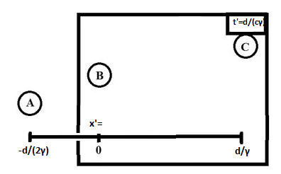 e makes use of the fact, that B meets x=d/2 at the same time as C meets x=d in A's frame and misses, that these events are not synchronous in B's frame, besides missing the length contraction.
