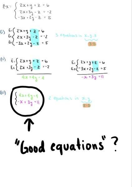 So here, I used the elimination/addition method to eliminate the variable ##z##. The main purpose of showing that, was to clarify what was meant by "good equations". I did a lackluster job of framing my question correctly.