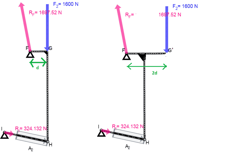 The discussion revolves around redesigning a lever mechanism that operates with a pneumatic cylinder. Participants explore the feasibility of using smaller bars and a four-bar linkage to achieve a shorter stroke and potentially a larger diameter cylinder. The conversation includes technical considerations regarding forces, torques, and the mechanics of the proposed designs.