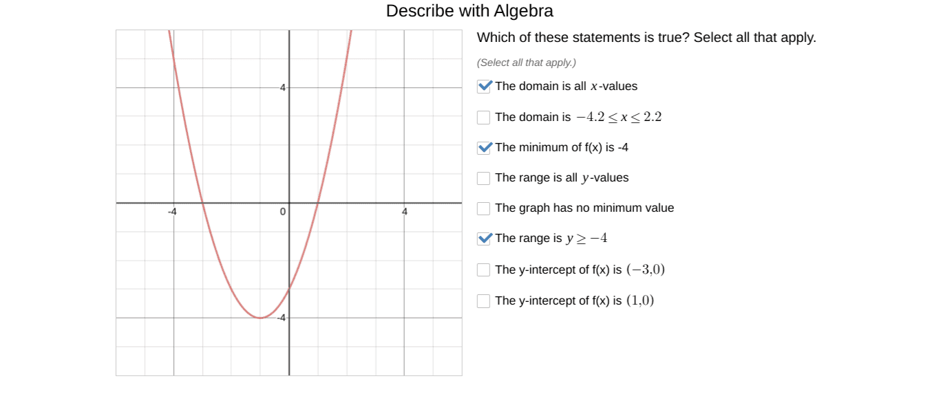 The discussion focuses on understanding domain and range functions in Algebra 2, specifically addressing the correct identification of y-intercepts and x-intercepts on a graph. The y-intercept is confirmed as (0, -3) and the x-intercepts as (-3, 0) and (1, 0). Participants emphasize the importance of attention to detail and suggest reviewing foundational Algebra 1 concepts before progressing to Algebra 2. The conversation highlights common misconceptions regarding minimum y-values and the interpretation of graph portions.