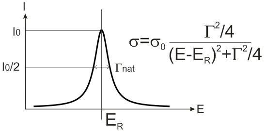 <br /> \sigma = \frac{\lambda^2 (2J+1)}{\pi (2S_a+1)(2S_b+1)} \frac{\Gamma^2 / 4}{(E-E_R)^2 + \Gamma^2/4}<br />