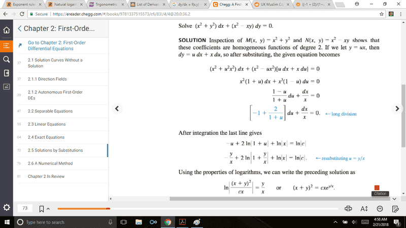 The discussion revolves around the integration of a differential equation involving the expression (-1 + \frac{2}{1+u}) du + \frac{dx}{x} = 0. Participants are examining the transition from this expression to the form -u + 2ln(1+u) + ln(x) = ln(c), questioning the reasoning behind the integration process and the appearance of ln(c) as a constant.