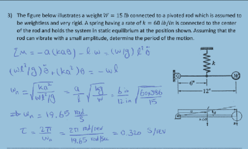 The discussion centers on understanding the derivation of the term -a(kaθ) in the context of vibrations related to a spring and hinge system. The variable 'a' represents the lever arm length (6 inches) used to relate the spring force to the angle θ. The equation F spring = xk, where x = aθ, establishes the relationship between the spring force and the angular displacement. The negative sign in the moment equation indicates the direction of forces acting on the system, with the weight tending clockwise (CW) and the spring force counterclockwise (CCW).