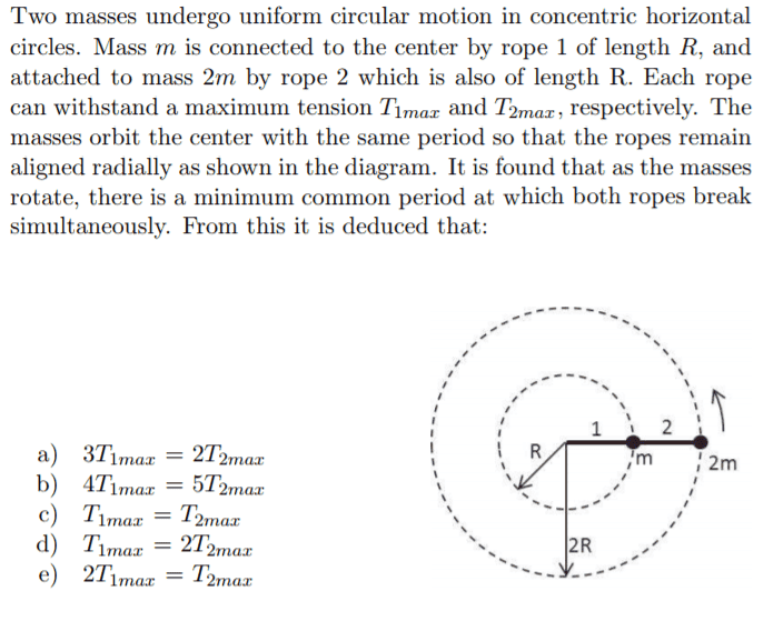 The discussion centers on the tension in circular motion for two ropes supporting masses. It is established that the maximum tensions, T1max and T2max, are equal when applying the centripetal force formula F = mv^2/R. However, it is clarified that while tensions may be equal, the velocities of the masses must be calculated separately, as they do not experience the same centripetal force due to differing masses. This distinction is crucial for understanding the dynamics of the system.