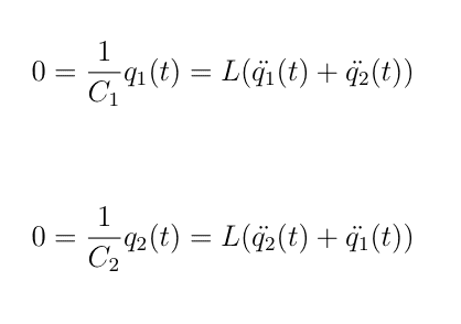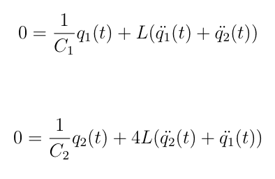 But I'm not so sure I can add the two 2nd derivatives of the charges like that. IF, however, this is true, then can I also claim that q_1(t)/C_1 = q_2(t)/C_2, by subtracting the two equations (or just setting them equal to each other?).
