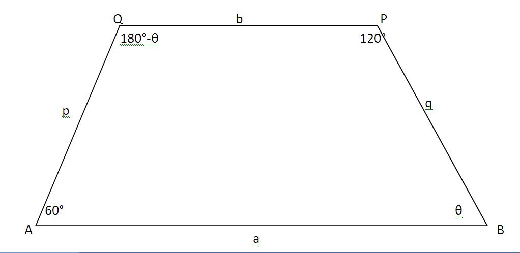 Let $ABPQ$ be the quadrilateral with $AB=a,\,BP=q,\,PQ=b,\,AQ=p,\,\angle BAQ=60^{\circ}$ and $\angle BPQ=120^{\circ}$.