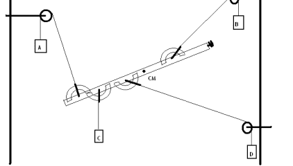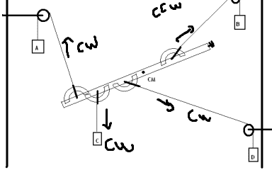 The discussion revolves around analyzing the forces and torques acting on a rod, with participants attempting to identify the directions of these forces and the corresponding torques. The subject area includes concepts from statics and dynamics in physics.