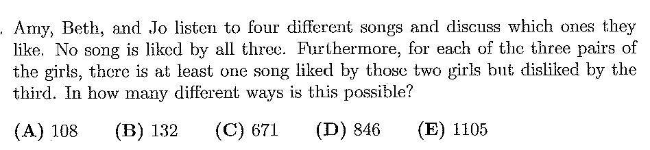 Therefore, 'B' should like only two songs that 'A' like, and the other one is the one that 'A' dislikes. The number of ways to choose the two songs(out of the 3 that A likes) is given by, \({}^3C_{2}\). Now if you think carefully you will see that only a pair of songs are left for 'C' to like, without violating the given criteria.