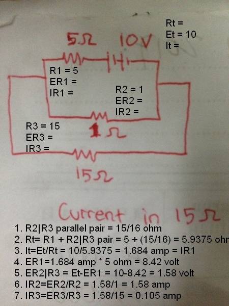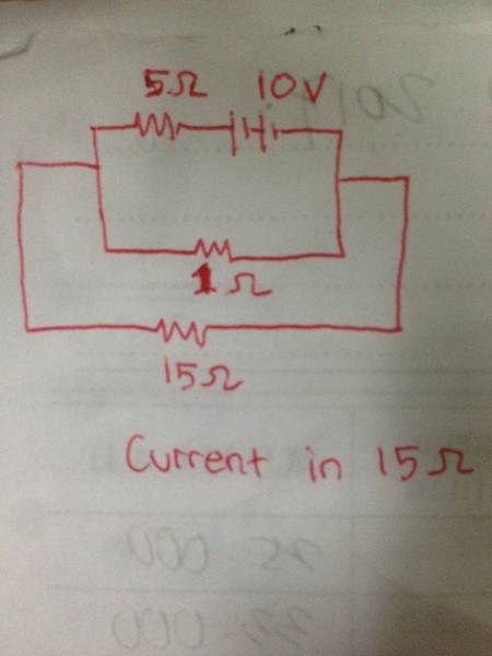 The discussion revolves around finding the current through a 15 Ohm resistor in a circuit that includes a 1 Ohm resistor, with participants exploring the configuration of these resistors, whether they are in series or parallel, and the implications of their arrangement on current and resistance calculations.