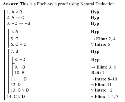 $C\lor D$. You may use any valid first-order deduction system, but you