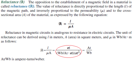 The unit of Reluctance is defined as At/Wb, which is derived from the relationship between magnetic flux (Wb) and magnetomotive force (At). The confusion arises from the cancellation of units during the derivation process. Specifically, when manipulating the equation for reluctance, the term m² cancels out, leading to the simplified unit of At/Wb. This is analogous to electrical resistance, where reluctance corresponds to resistance in circuits.