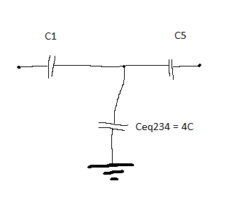 Participants express differing views on the role of capacitor C5 and the implications of open terminals on capacitance. There is no consensus on whether the equivalent capacitance is affected by the isolation of certain components, leading to an unresolved discussion.