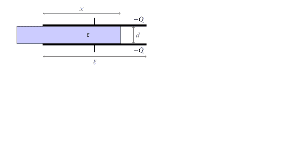 - Between two conducting plates (length ## l ##, width ## w ## and distance ## d ##) there is an insulator (permittivity \epsilon). The capacitor is charged with voltage ## V ## (charge ## Q ##). After this the voltage source is removed. The insulator is moved to the left in the direction of ## l ## a distance ## l-x ##. Calculate the force that the electric field tries to drag the insulator back
