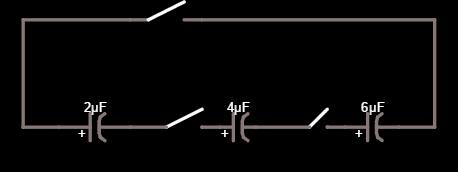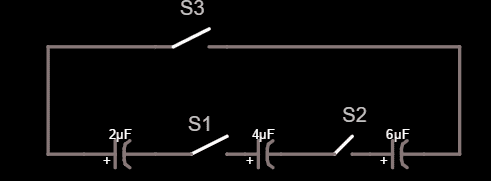 There are three capacitors C1 = 2 uF, C2 = 4 uF, C3 = 6 uF. Each of these capacitors were connected to 200-V voltage source so every capacitor has been fully charged. Then, the three capacitors are connected like the image above. When S1 and S2 are closed, but S3 is opened, determine the voltage across each resistors!