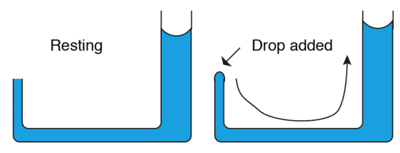 3) when a drop is added on the top of thinner tube, system re-equilibrates flowing on the right, increasing the height in the right tube.