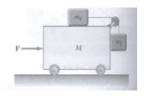 First thing: That's a doubt I have, since there is no friction, the force F applied on the cart won't actually affect the block m1 in anyway, right? I mean, if there was no m2, the block m1 would stand in the air while M rushed in a straight line, right?