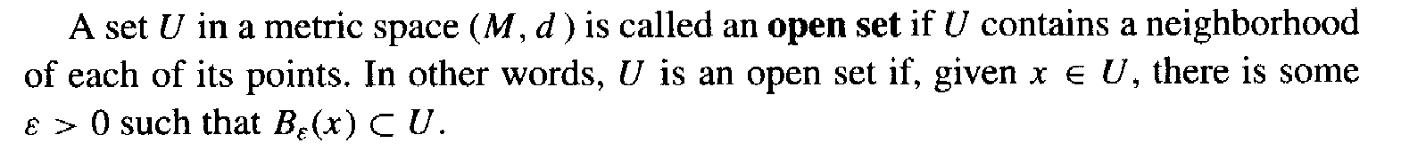 " ... ... In other words, $$U$$ is an open set if, given $$x \in U$$, there is some $$\epsilon \gt 0$$ such that $$B_\epsilon (x) \subset U$$ ... ... "