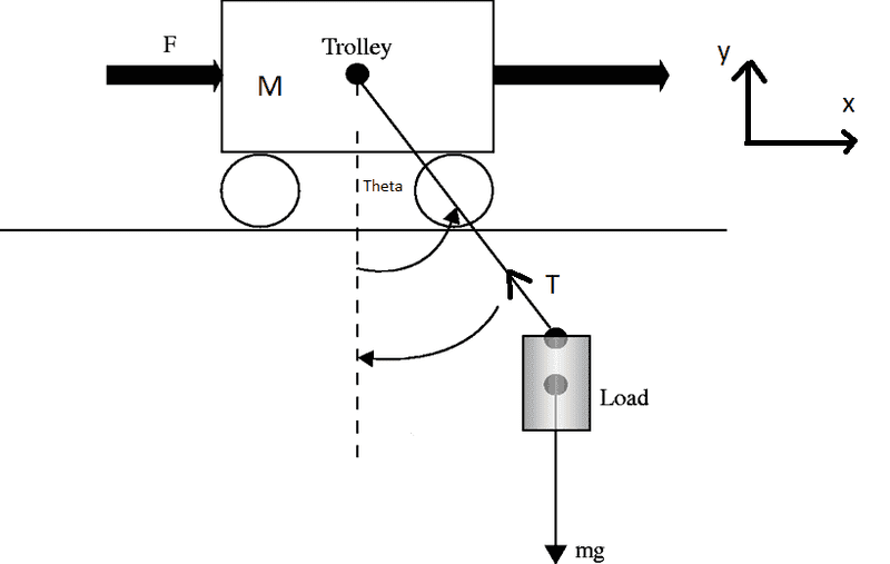 I am trying to derive an expression for the Tension T in the massless bar in the given photo. Where there is a cart that is moving only in the x-direction and the bar is rotating around a point pivoted at the cart with angle theta. The expression that I have is deduced from:
