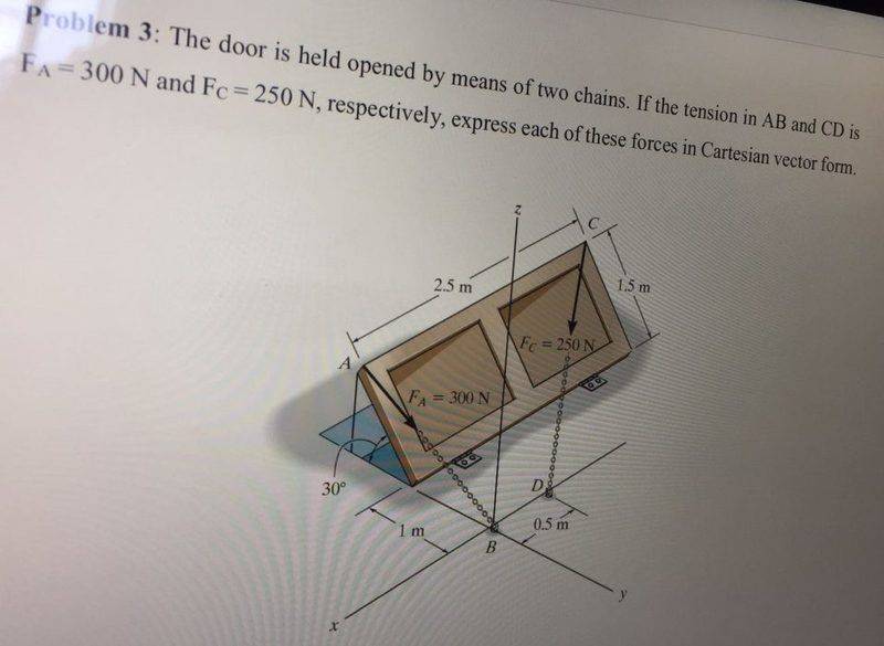 The door is held open by the means of 2 chains. If the tension in AB and CD is Fa = 300 N and Fc = 250 N, respectively, express each of these in Cartesian Vector Form