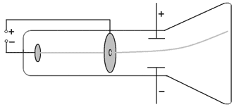 In cathode ray discharge tube,negative electrode is cathode and positive electrode is anode.