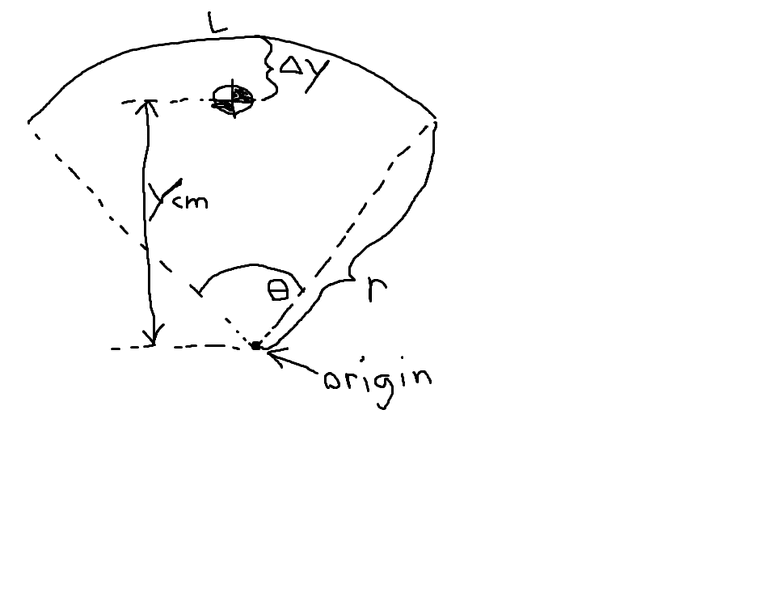 y_{cm}=\frac{1}{M}\int ^{ \theta / 2 }_{ - \theta / 2 } r cos\left(\theta \right) \frac{M}{L} r \: d\theta