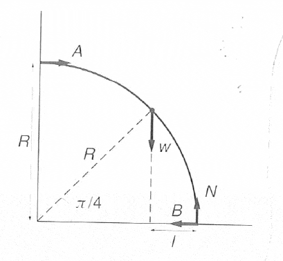 On page 252 of Kleppner's Introduction to Mechanics (2d. Ed.) in Example 7.5, Kleppner analyzes the forces and torques on a uniform rod that have been bent into a quarter-circle of radius R and length PI*R/2. His diagram is attached.