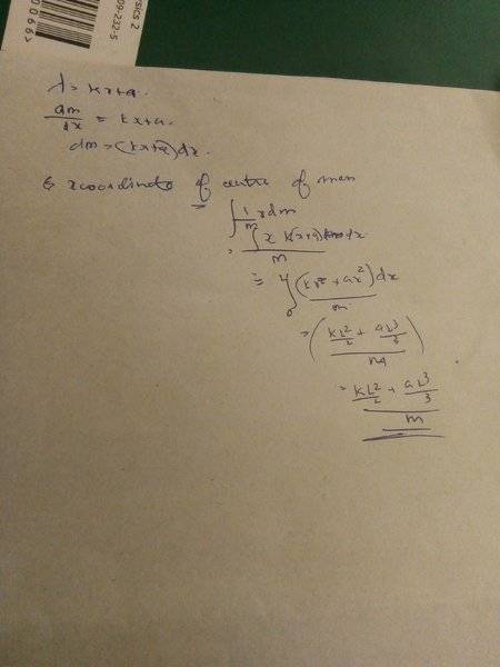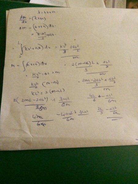 The discussion revolves around finding the center of mass of a non-uniform rod, where the mass increases linearly with distance from one end. The original poster describes the setup involving linear density and attempts to express the center of mass in terms of mass, length, and linear density parameters.