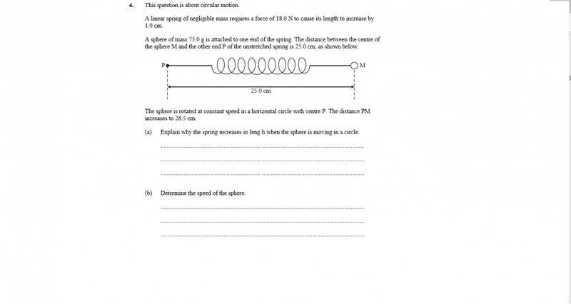 A sphere of mass 75.0 g is attached to one end of the spring. The distance between the centre of the sphere M and the other end P of the unstretched spring is 25.0 cm