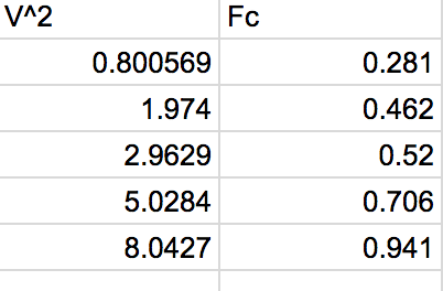 from the lab, I collected data for each mass and now we have to plot Fc vs v^2 and draw a line of best fit and find the slope of the line. In relation to the line, try to find the mass of the rubber stopper.