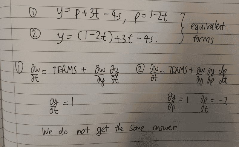 not looking through any variables that may themselves be functions of other variables. In your alternative approach you are treating t as a function of p,