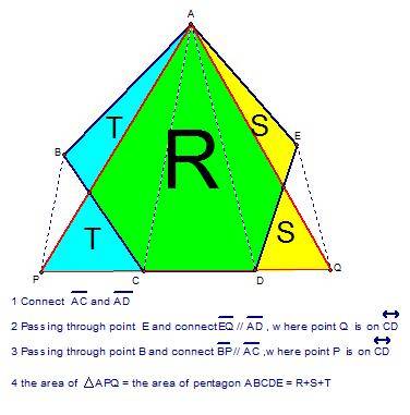 The discussion revolves around the problem of transforming a pentagon into a triangle while maintaining equal area. Participants explore various assumptions and methods related to this geometric transformation.