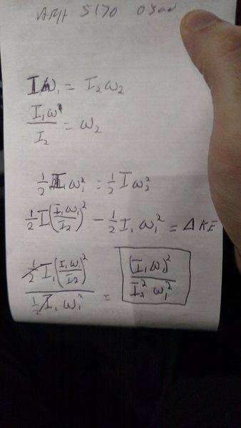 If I rework using I = mr2 and ω = v/r, would the rest of my thought process be correct in using the angular velocity at moment two, to find a new kinetic energy, which could then be subtracted from the original to determine its change?