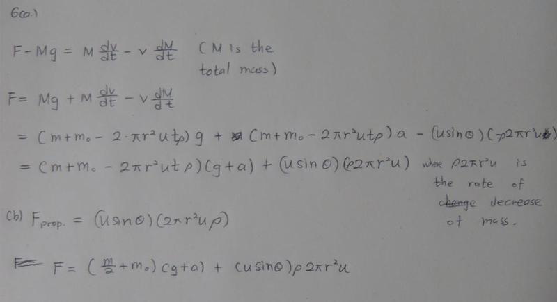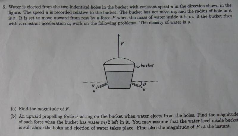 The discussion centers on the physics problem involving changing mass and constant force, specifically examining the propulsion force in a system where mass decreases over time. The equation used is F = m(dv/dt) - v(dm/dt). Participants assert that the propulsion force remains constant despite decreasing water pressure and velocity, leading to simplified calculations. The consensus is that if the ejected speed is constant, the propulsion force can be treated as constant for the purposes of the problem.