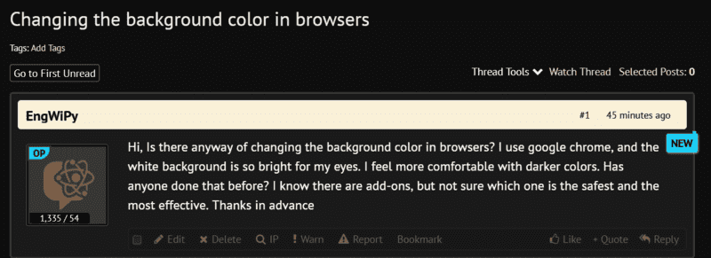 The discussion revolves around methods for changing the background color in web browsers, specifically focusing on Google Chrome. Participants explore various approaches, including browser extensions and screen brightness adjustments, to alleviate discomfort caused by bright white backgrounds.