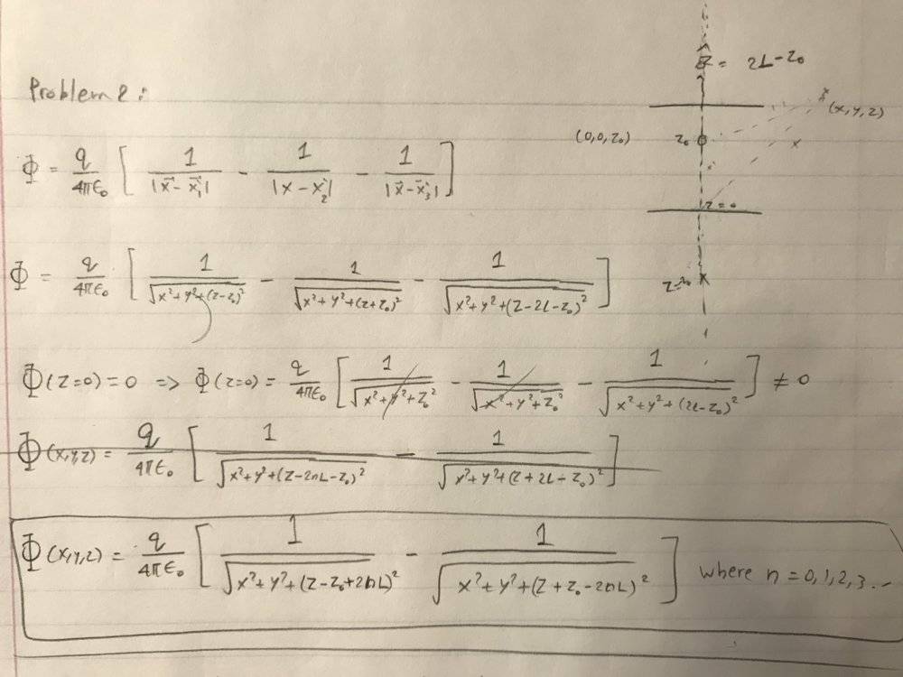 - Participants express uncertainty regarding their solutions, particularly in relation to the potential at z=0. There is mention of needing to consider an infinite series of image charges, and questions arise about the form of this series and its implications for the problem.