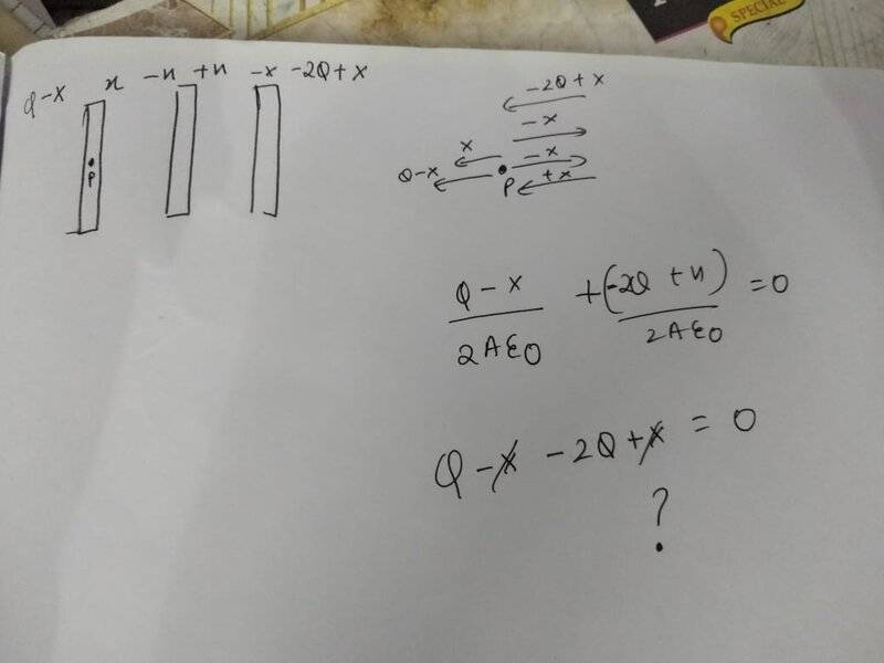 Similarly the other side of the neutral sheet has x charge and the inner side of the rightmost sheet has -x charge while the outer side has -2Q + x charge