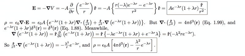 They specify the answer for charge density should be: ##\rho = \epsilon_0 A(4\pi \delta^3(r)-\lambda^2e^{-\lambda r}/r)##
