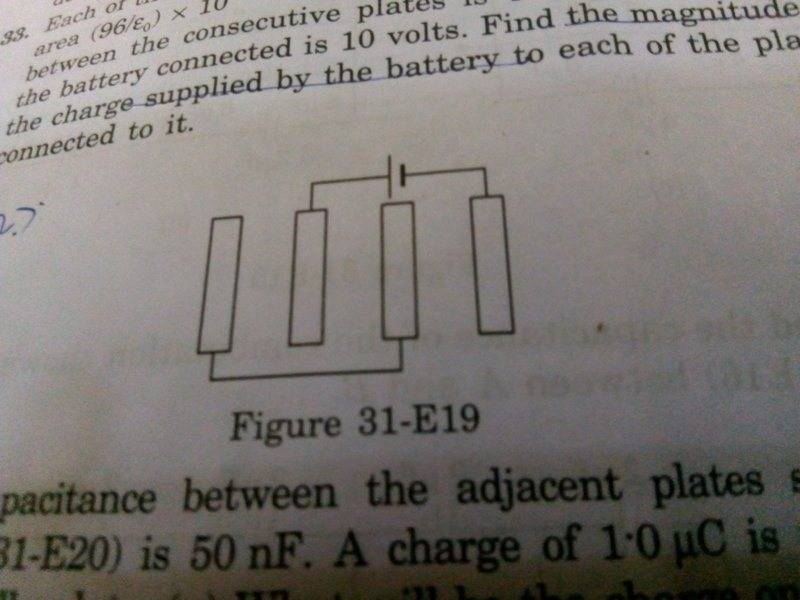 Each plate in the figure has area a and separation d , end of battery is e find charge supplied by battery