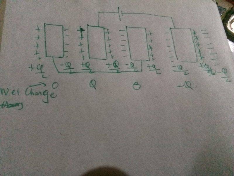 At last I know what you mean by "q/2 to each facing plate". You meant q/2 to each face of one plate (and -q/2 to each face of the other plate). A pity you did not try to explain that before.carlyn medona said:Okay, I thought this is how charge gets distributed, please correct me if I am wrong
