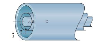 The figure shows a section of three long charged cylinders centered on the same axis. Central cylinder A has a uniform charge qA= +3q0.