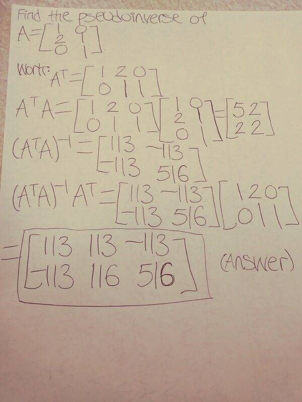 The discussion revolves around the computation of the pseudoinverse of a matrix, specifically focusing on linear algebra techniques and verification methods for matrix operations.