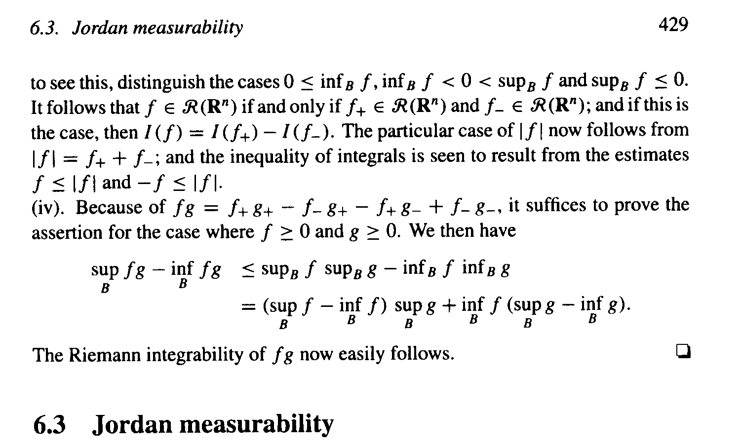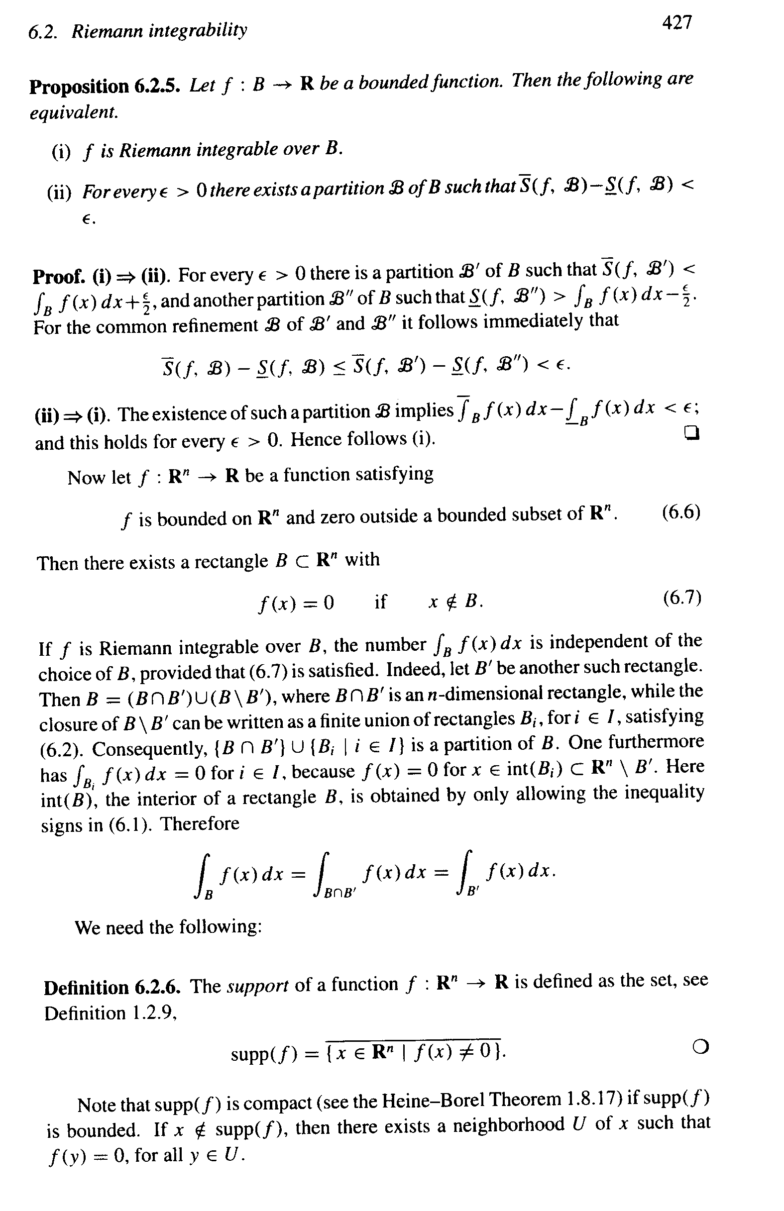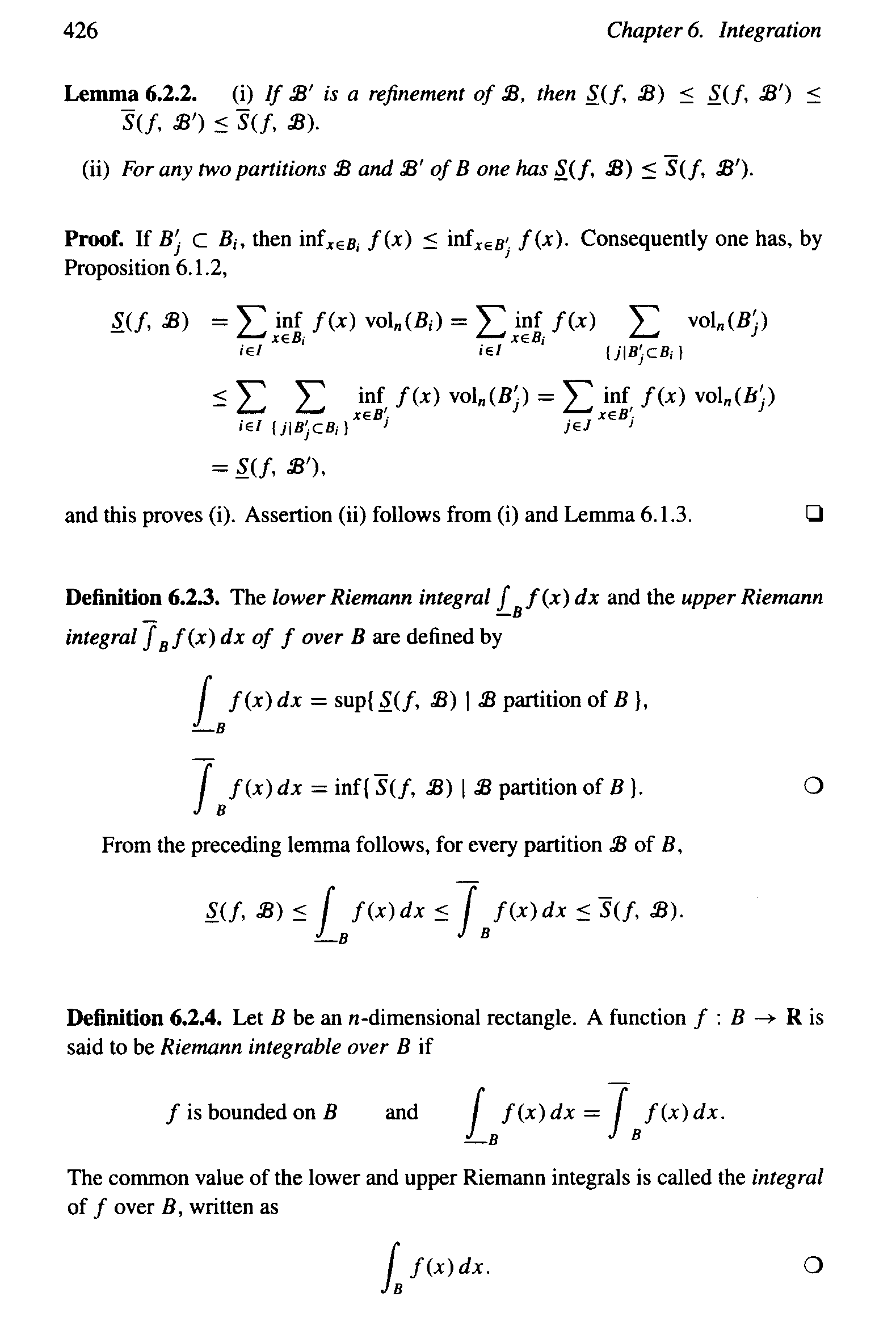 [math] \overline{ \int_{B} } f(x) dx = \text{ inf} \ \{ \overline{S} (f, \mathscr{B} ) \ \ | \ \ \mathscr{B} \text{ is a partition of } B \} \ \ \leq \ \ \text{ inf} \ \{ \overline{S} (g, \mathscr{B} ) \ \ | \ \ \mathscr{B} \text{ is a partition of } B \} \ = \ \overline{ \int_{B} } g(x) dx [/math] ... ... ... ... ... (1)Similarly ... ... [math] \underline{ \int_{B} } f(x) dx \leq \underline{ \int_{B} } g(x) dx [/math] ... ... ... ... ... (2)(1), (2) [math] \Longrightarrow \int_{B} f(x) dx \leq \int_{B} g(x) dx [/math] ... ...