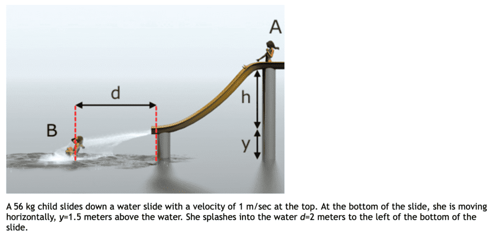 - A 56 kg child slides down a water slide with a velocity of 1 m/sec at the top. At the bottom of the slide, she is moving horizontally, y=1.5 meters above the water. She splashes into the water d=2 meters to the left of the bottom of the slide. Assuming potential energy to be zero at the water level, what is the mechanical energy of the child at the top of the slide?